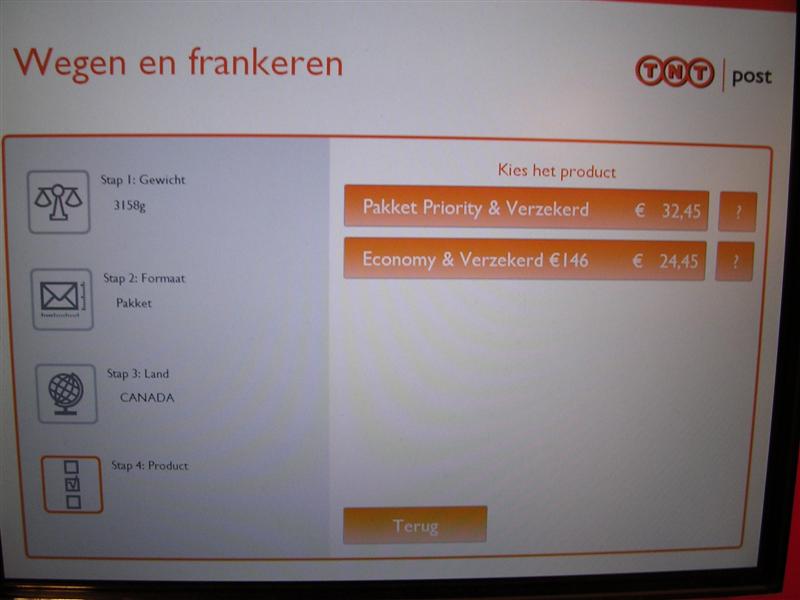 (158). Na het invullen volgt een scherm met de keuze er op: Int Pakket Plus ROW 5 kg zone Econ